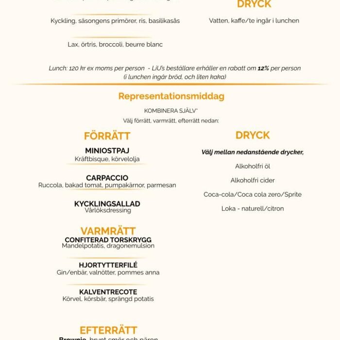 Boka en representationslunch eller middag via oss. Vi erbjuder menyer anpassade för både formella och informella tillfällen, med fokus på kvalitet, variation och hållbarhet.